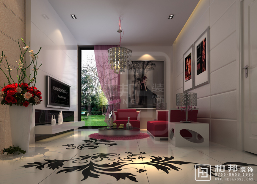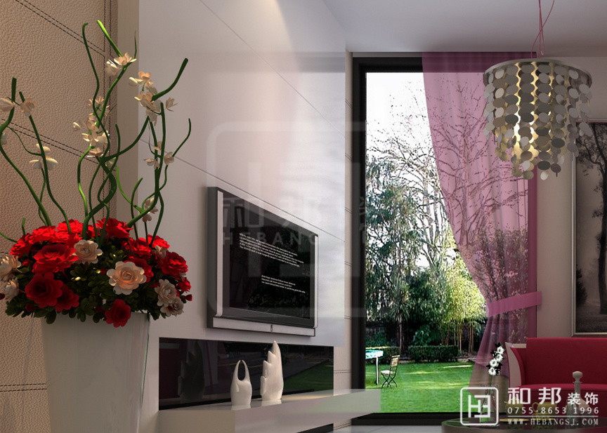 紅色系的沙發(fā)、電視柜旁邊搭配一株紅粉搭配的植物,給人一種協調的美感,傳遞著舒適的氣息,明亮的光線從寬大的窗戶照進,讓客廳空間顯得寬敞大氣。