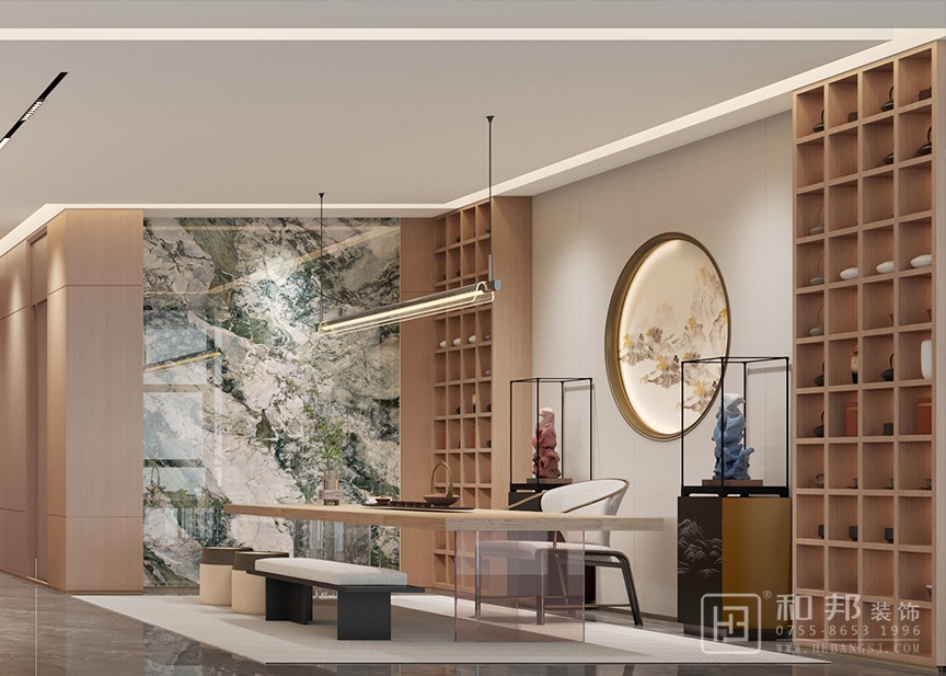 本案為新中式風格高端餐飲場所,以木色為基調,融合傳統與現代元素通過中式符號(山水掛畫、博古架 )與現代材質、燈光結合,打造出兼具文化底蘊與舒適體驗的宴請空間,適配商務、高端聚會場景。